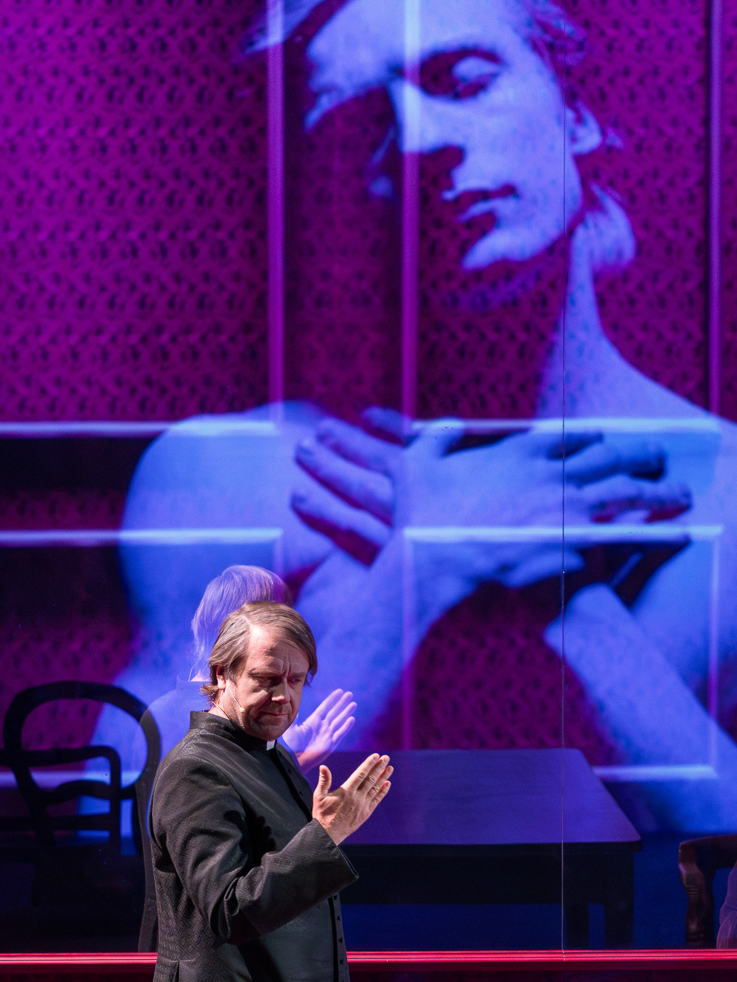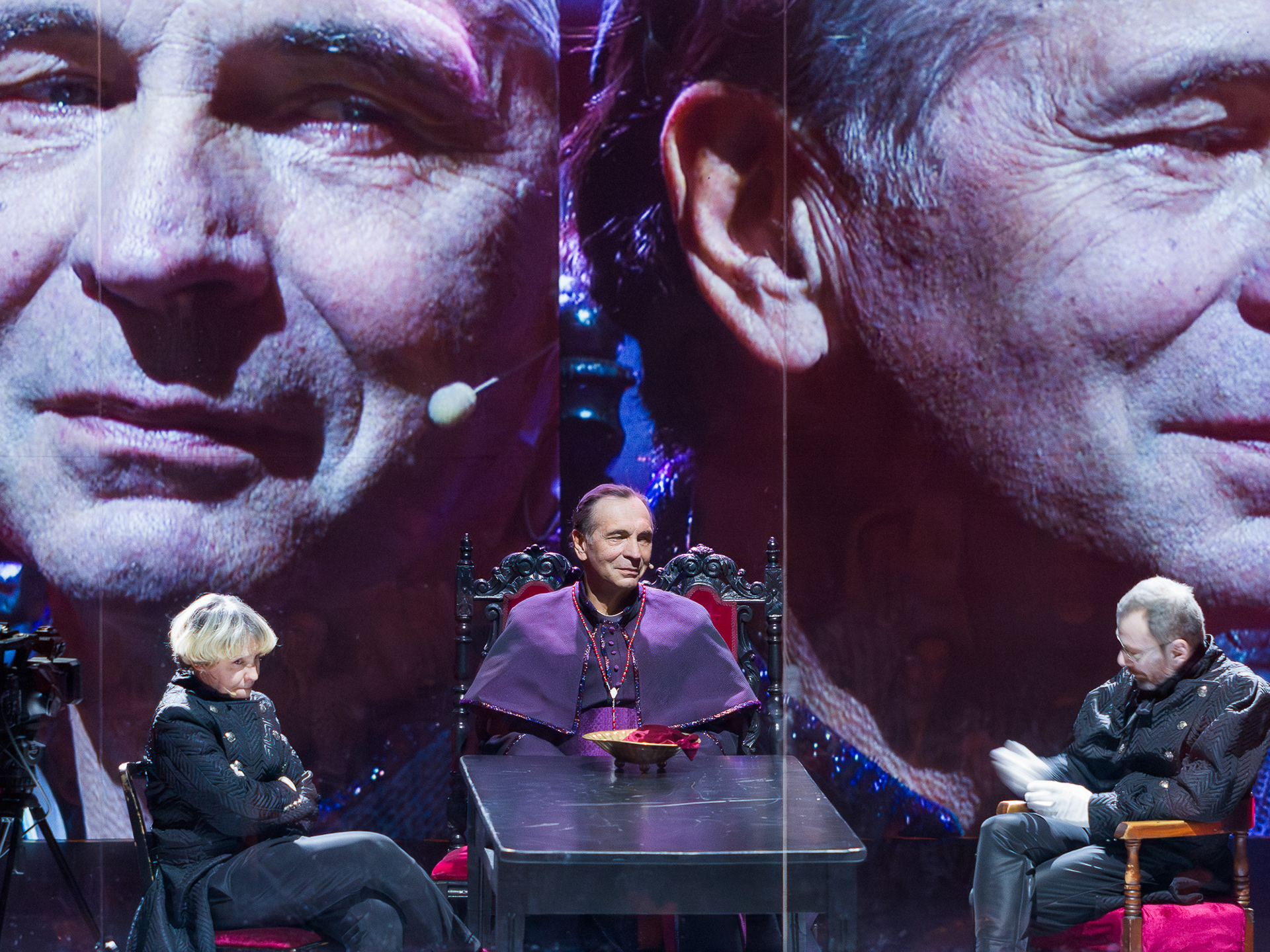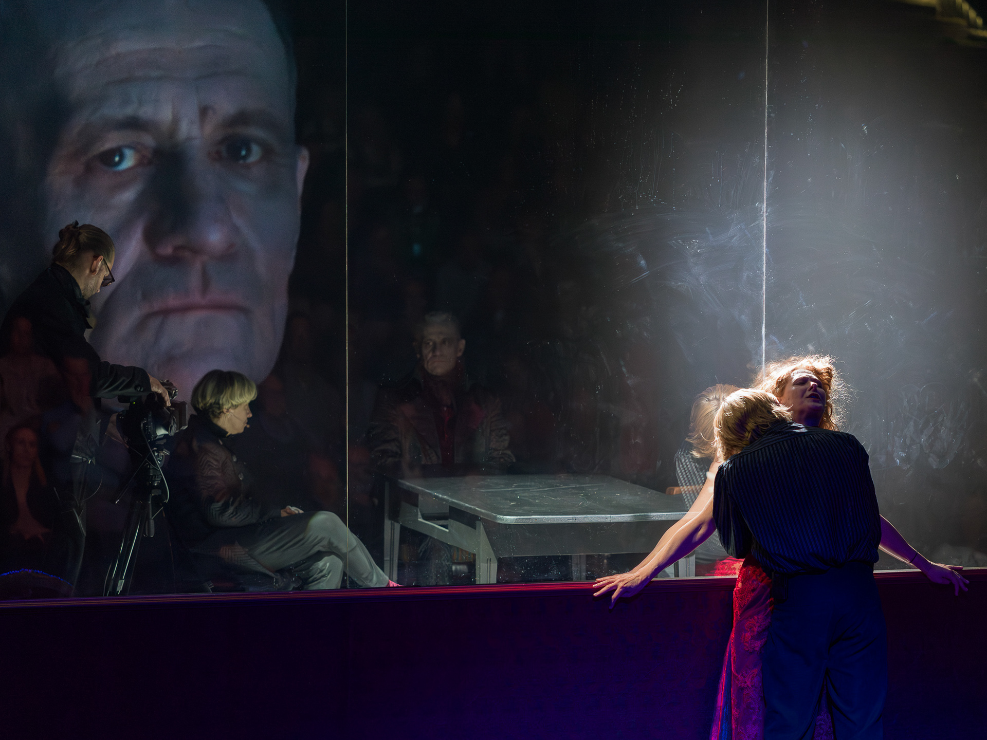As the multimedia designer (together with Peter Fick), I created the visual layer of the performance, which became a crucial part of its dramaturgy. The projections highlighted the tension between the characters’ public testimonies and their inner turmoil, amplifying gestures, faces, and subtle expressions that might otherwise remain invisible. By combining live camera work with carefully constructed visual compositions, the multimedia extended the stage space beyond the physical set, immersing the audience in both the intimacy and the alienation of the trial.