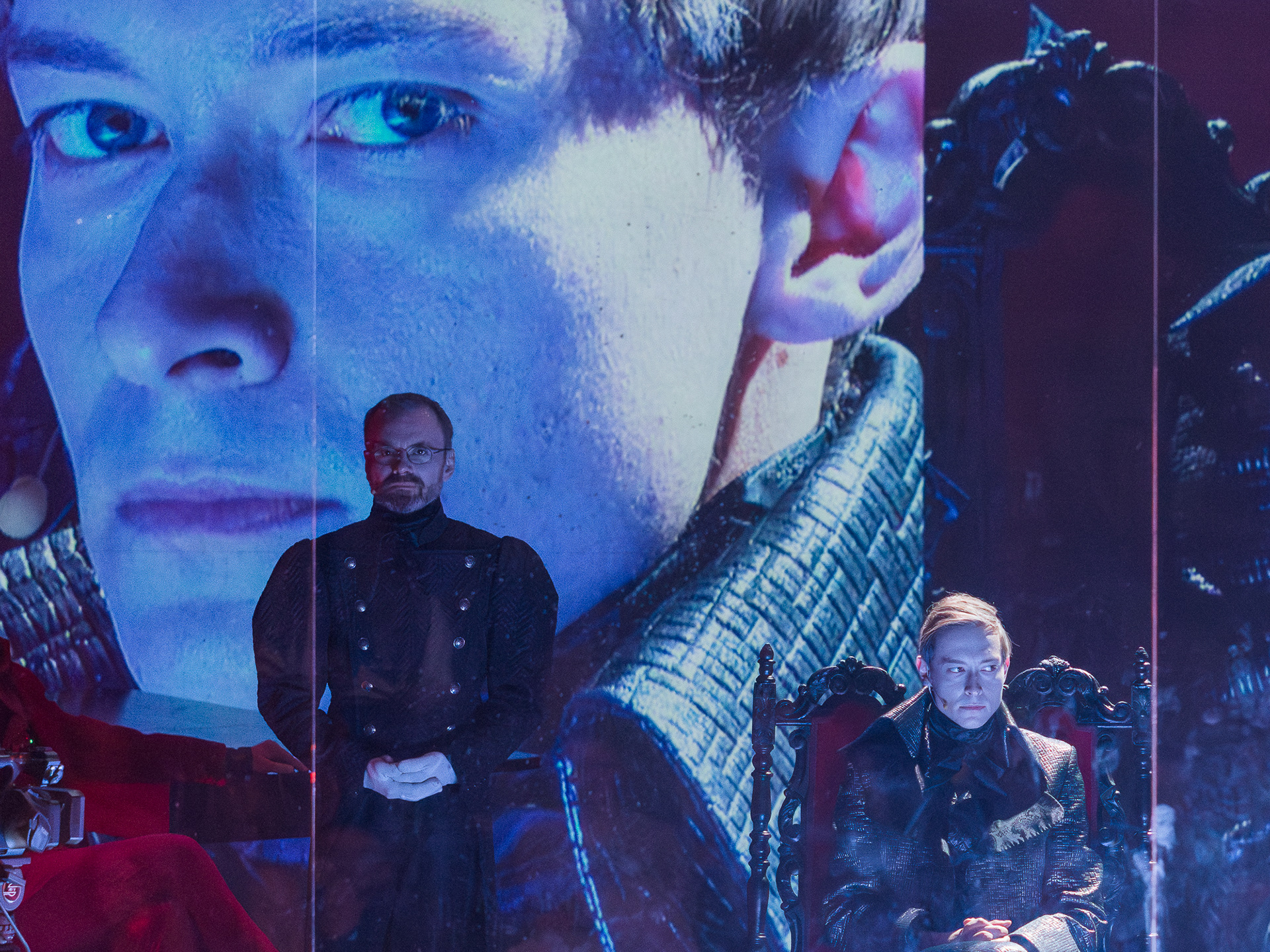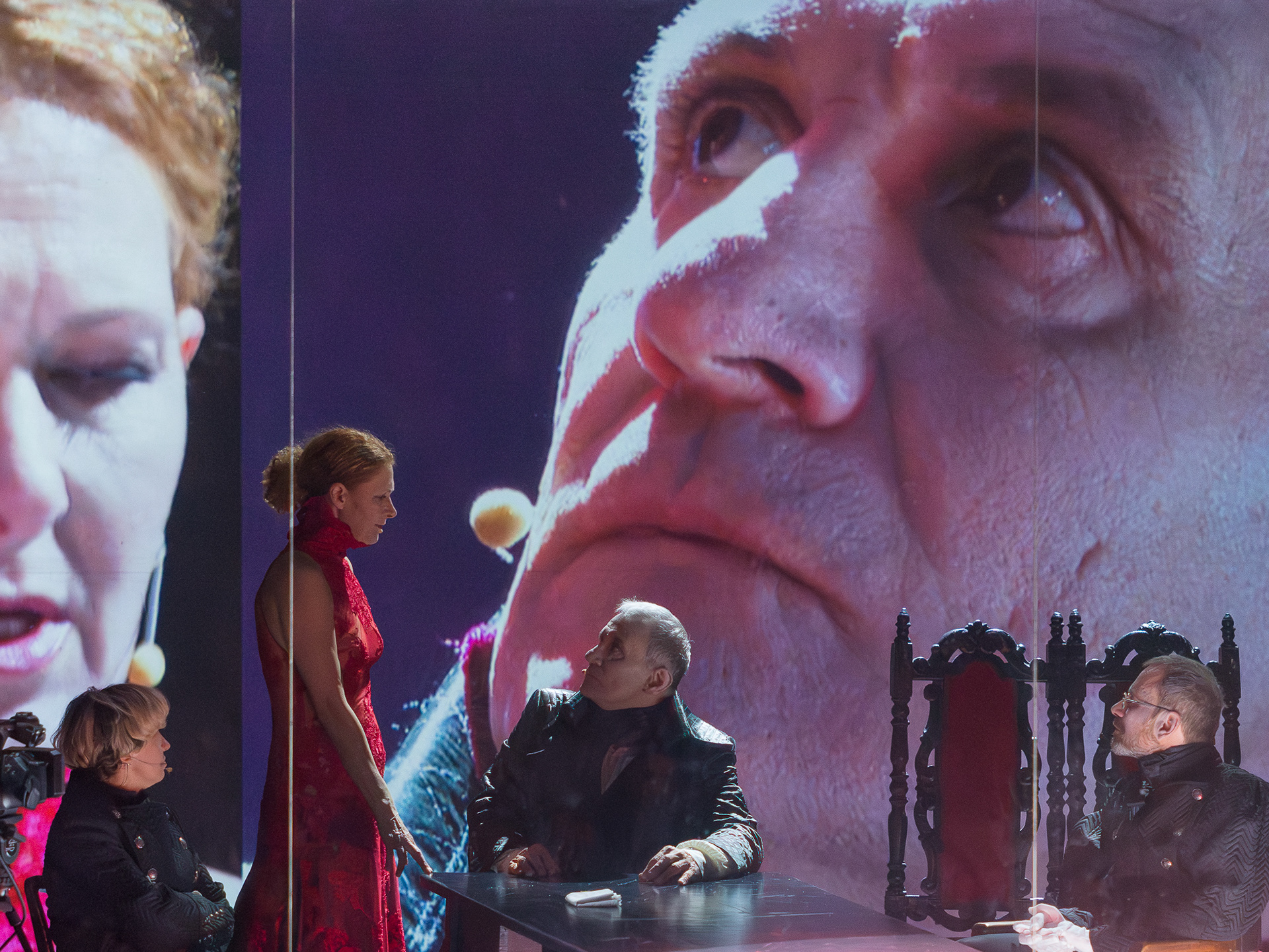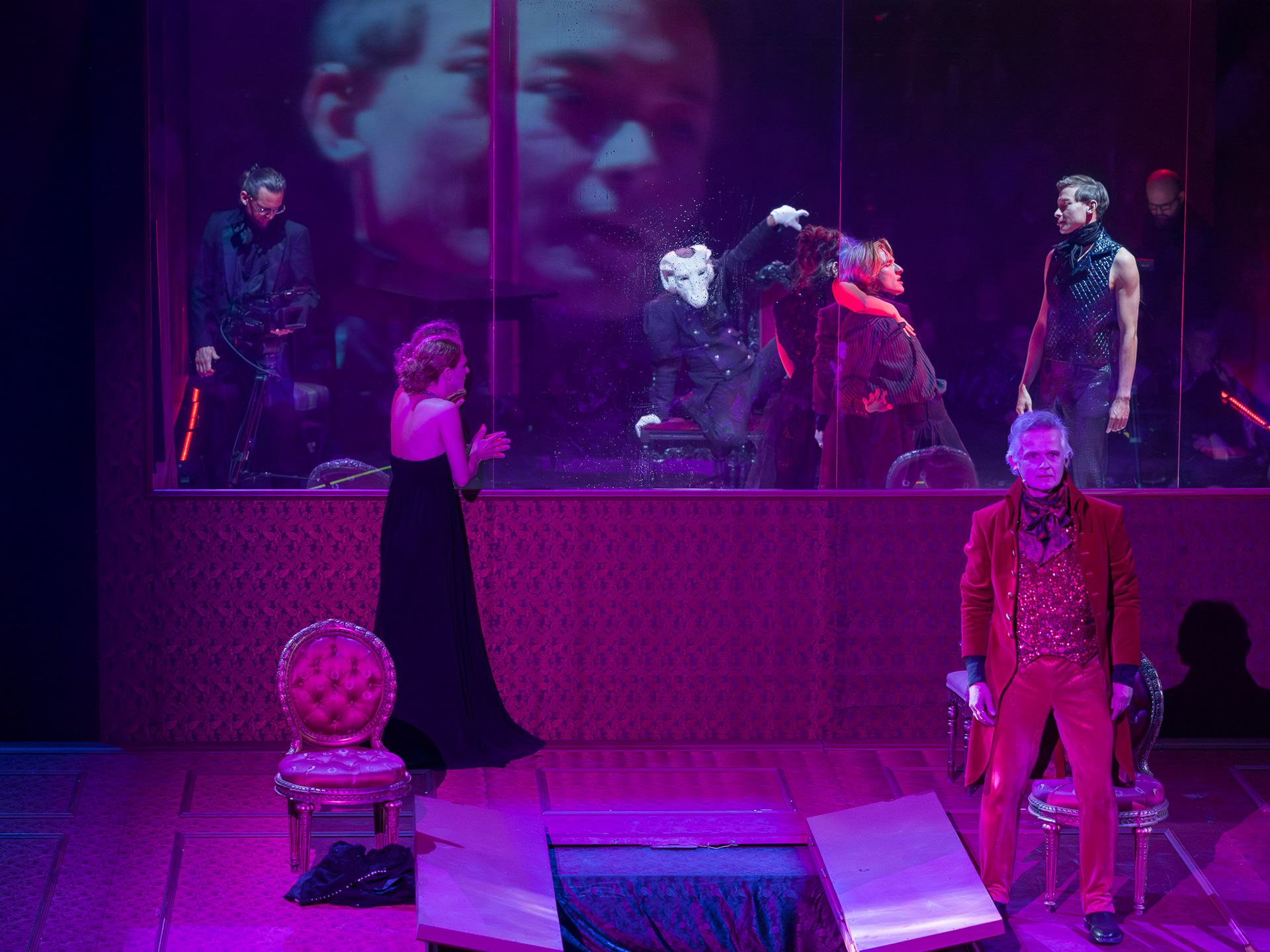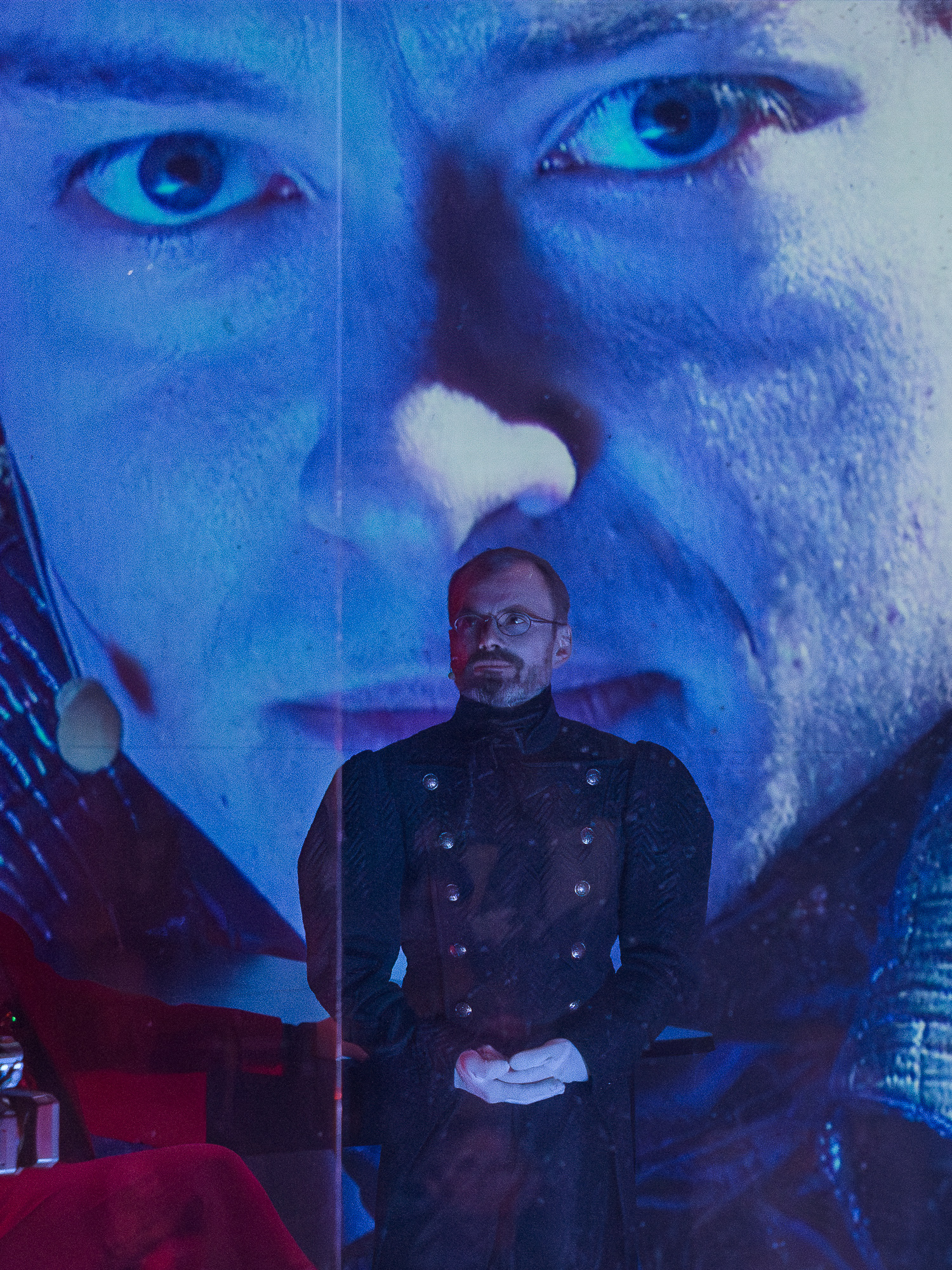 The visual concept was developed in close collaboration with scenographer and lighting designer Małgorzata Szydłowska and composer Dominik Strycharski, ensuring that image, sound, and light worked together as one language. The result was a performance where multimedia not only illustrated but also interrogated the story itself, emphasizing the fragile boundary between reality and performance, freedom and control.