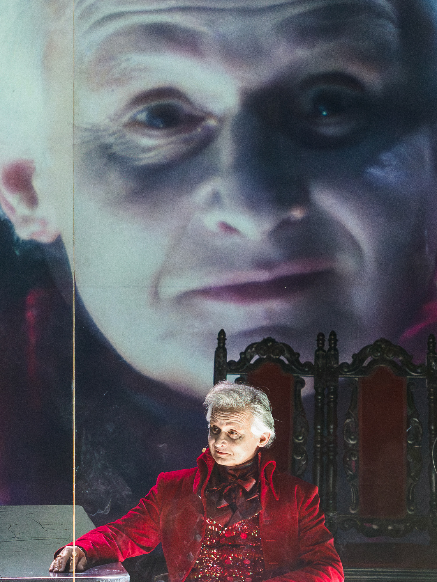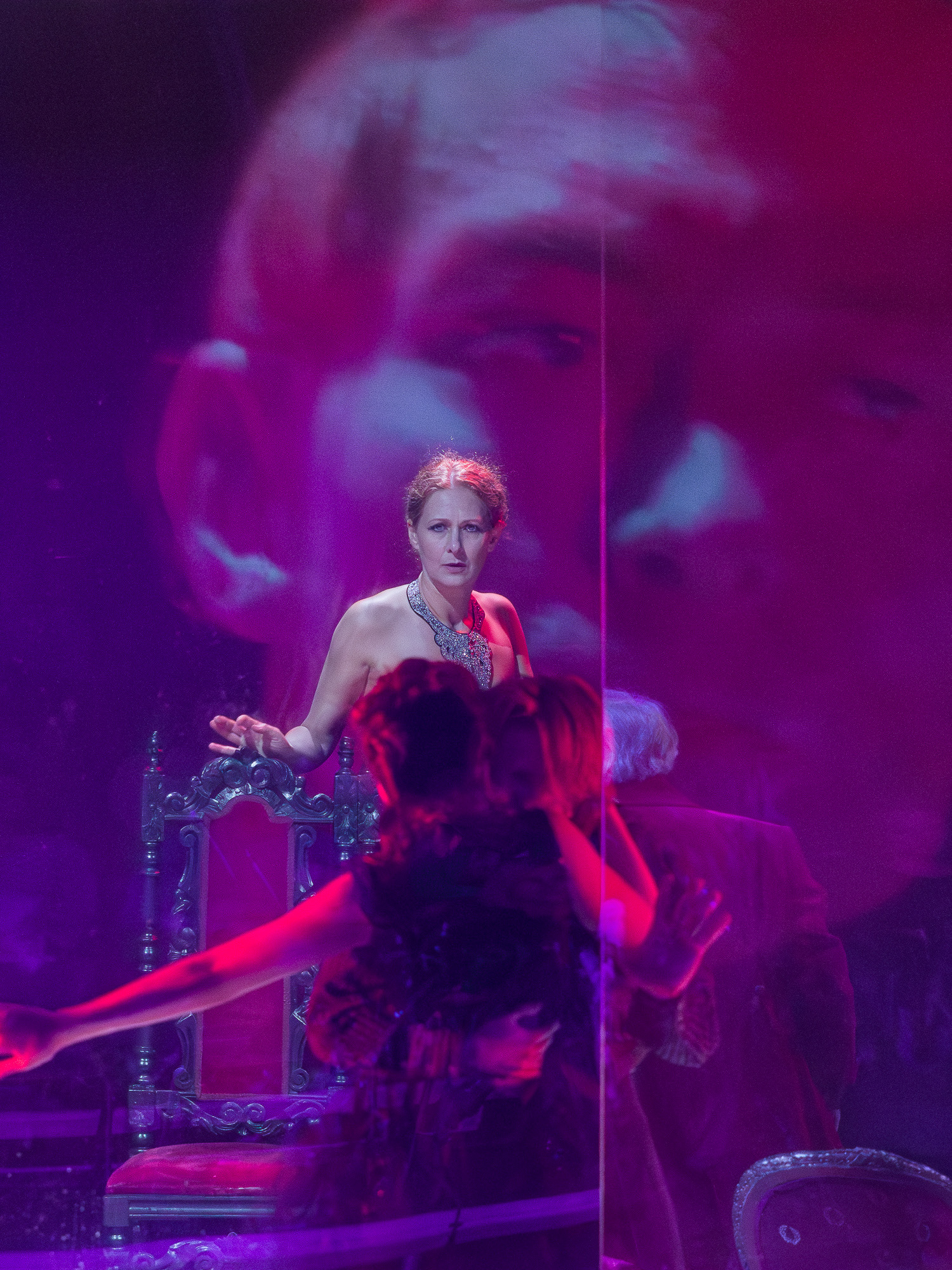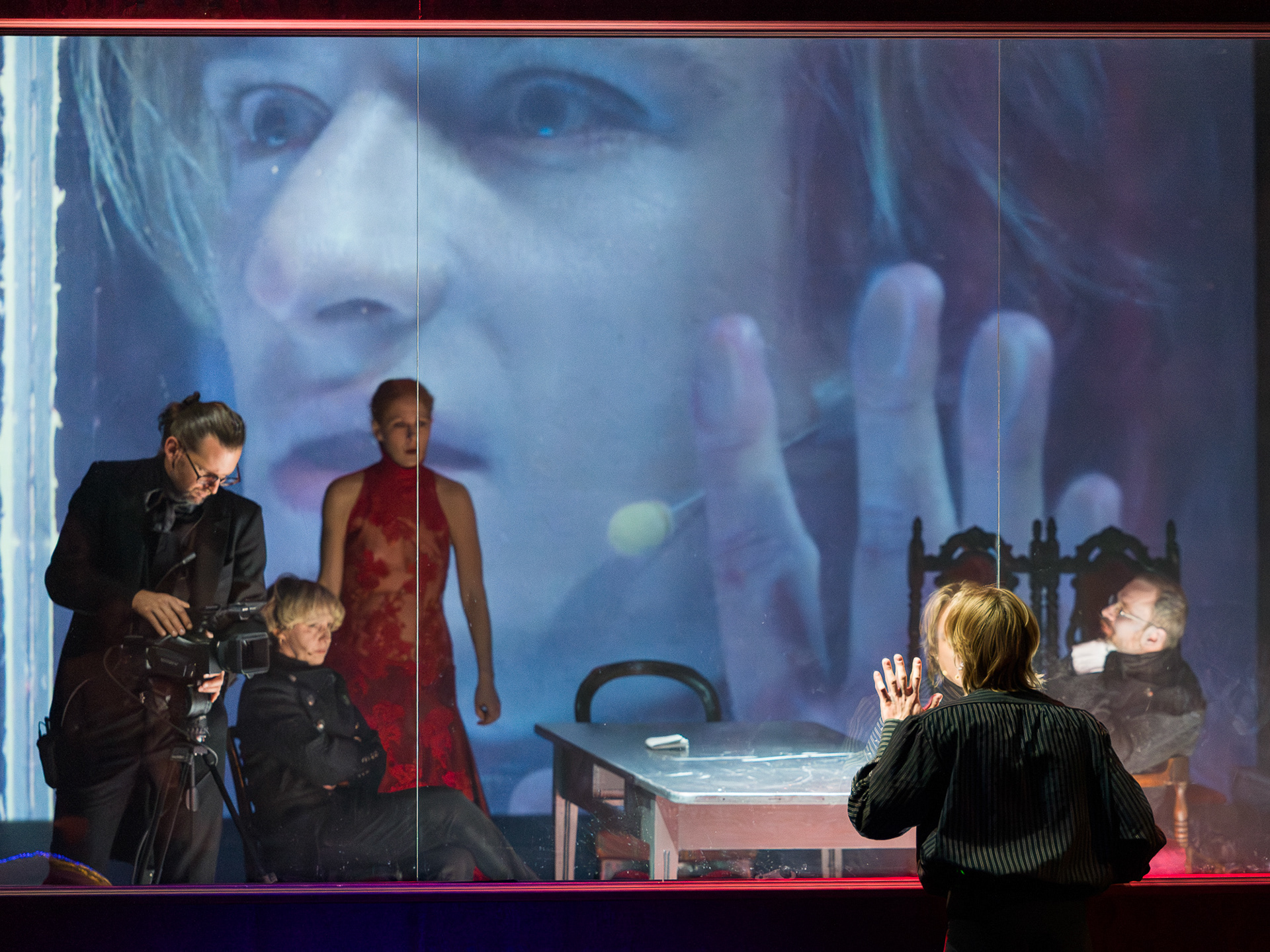 The visual concept was developed in close collaboration with scenographer and lighting designer Małgorzata Szydłowska and composer Dominik Strycharski, ensuring that image, sound, and light worked together as one language. The result was a performance where multimedia not only illustrated but also interrogated the story itself, emphasizing the fragile boundary between reality and performance, freedom and control.