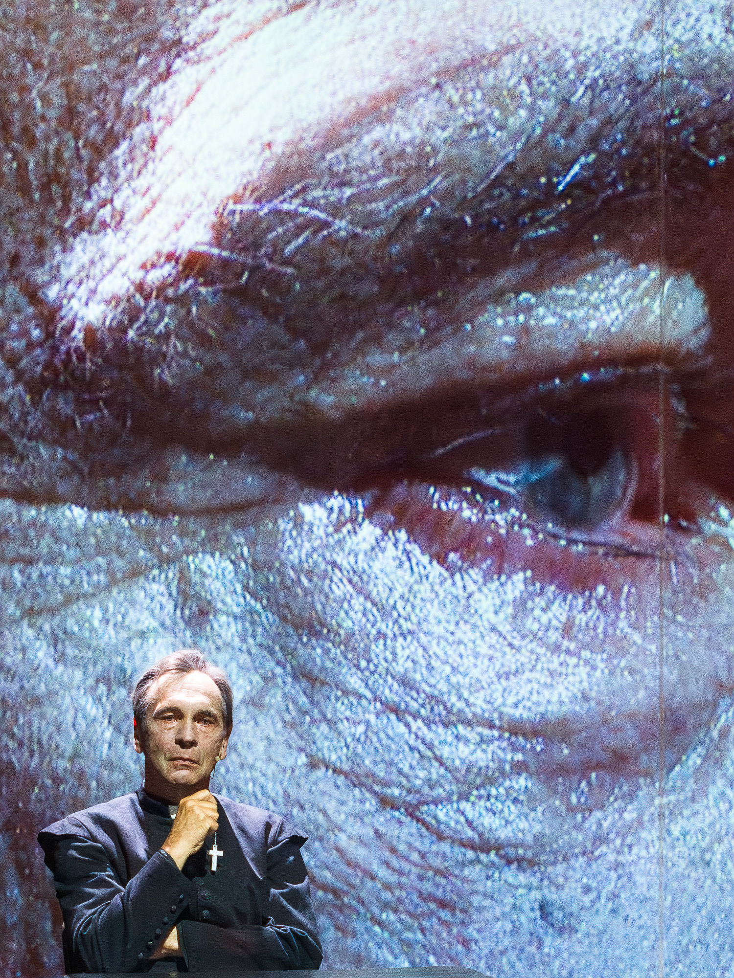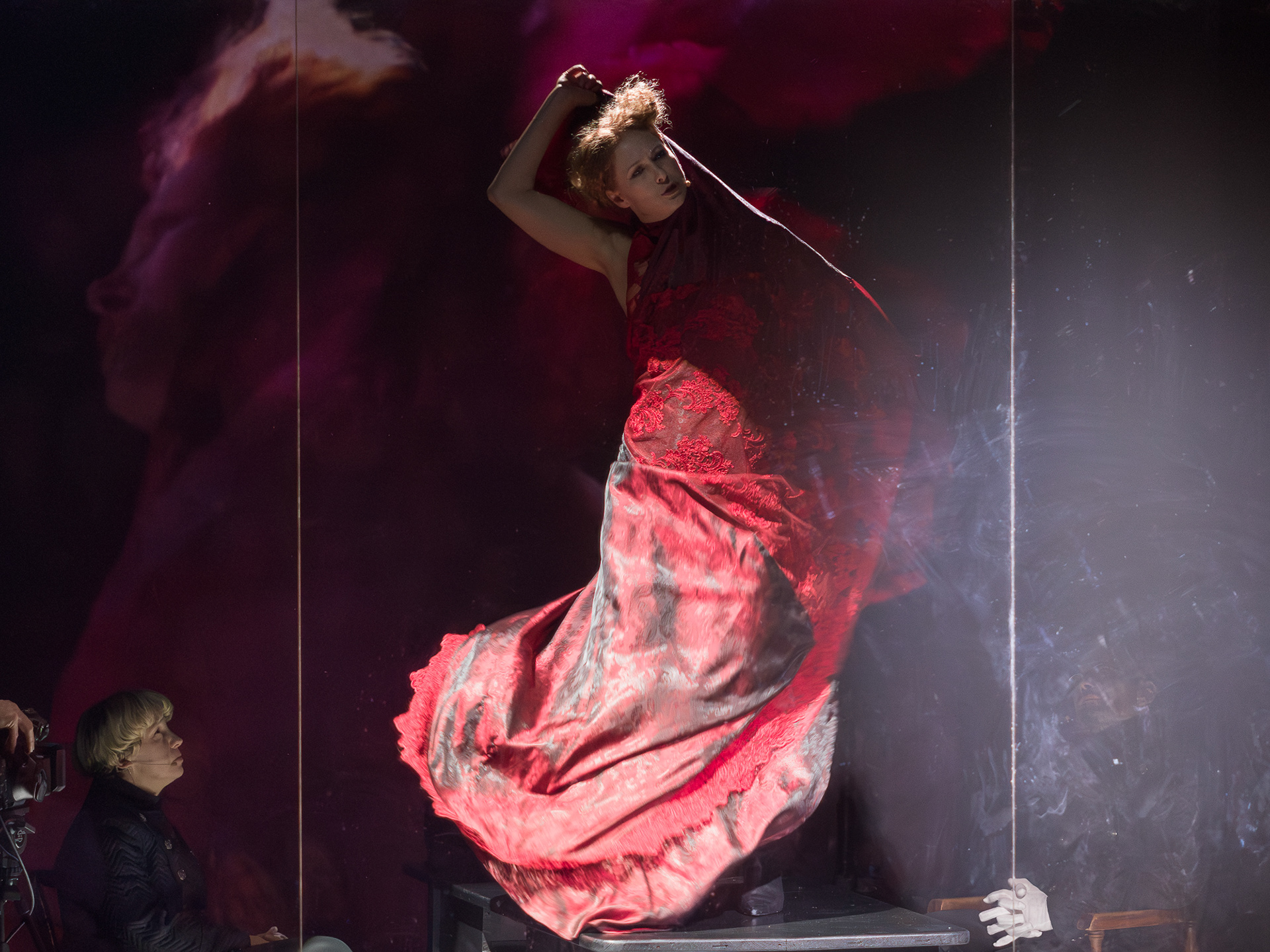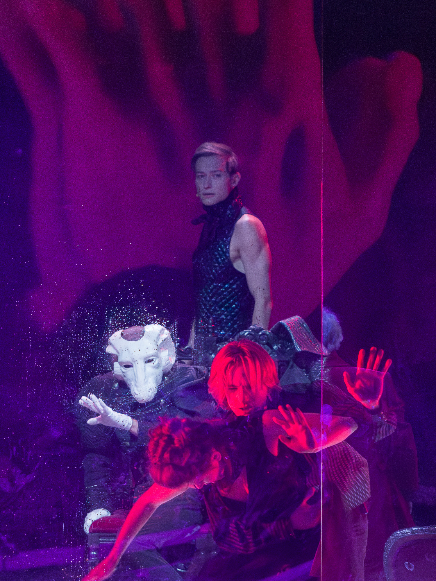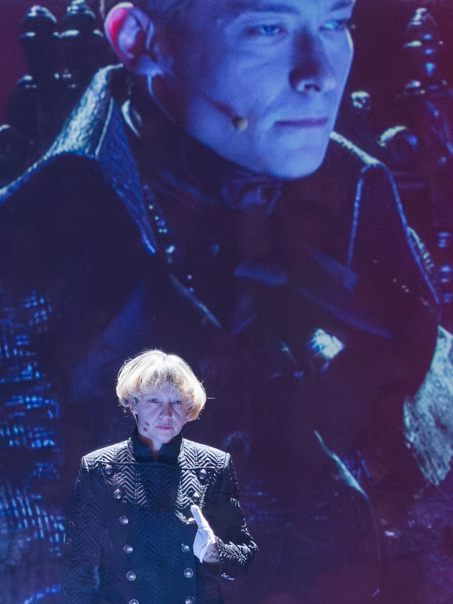 The visual concept was developed in close collaboration with scenographer and lighting designer Małgorzata Szydłowska and composer Dominik Strycharski, ensuring that image, sound, and light worked together as one language. The result was a performance where multimedia not only illustrated but also interrogated the story itself, emphasizing the fragile boundary between reality and performance, freedom and control.