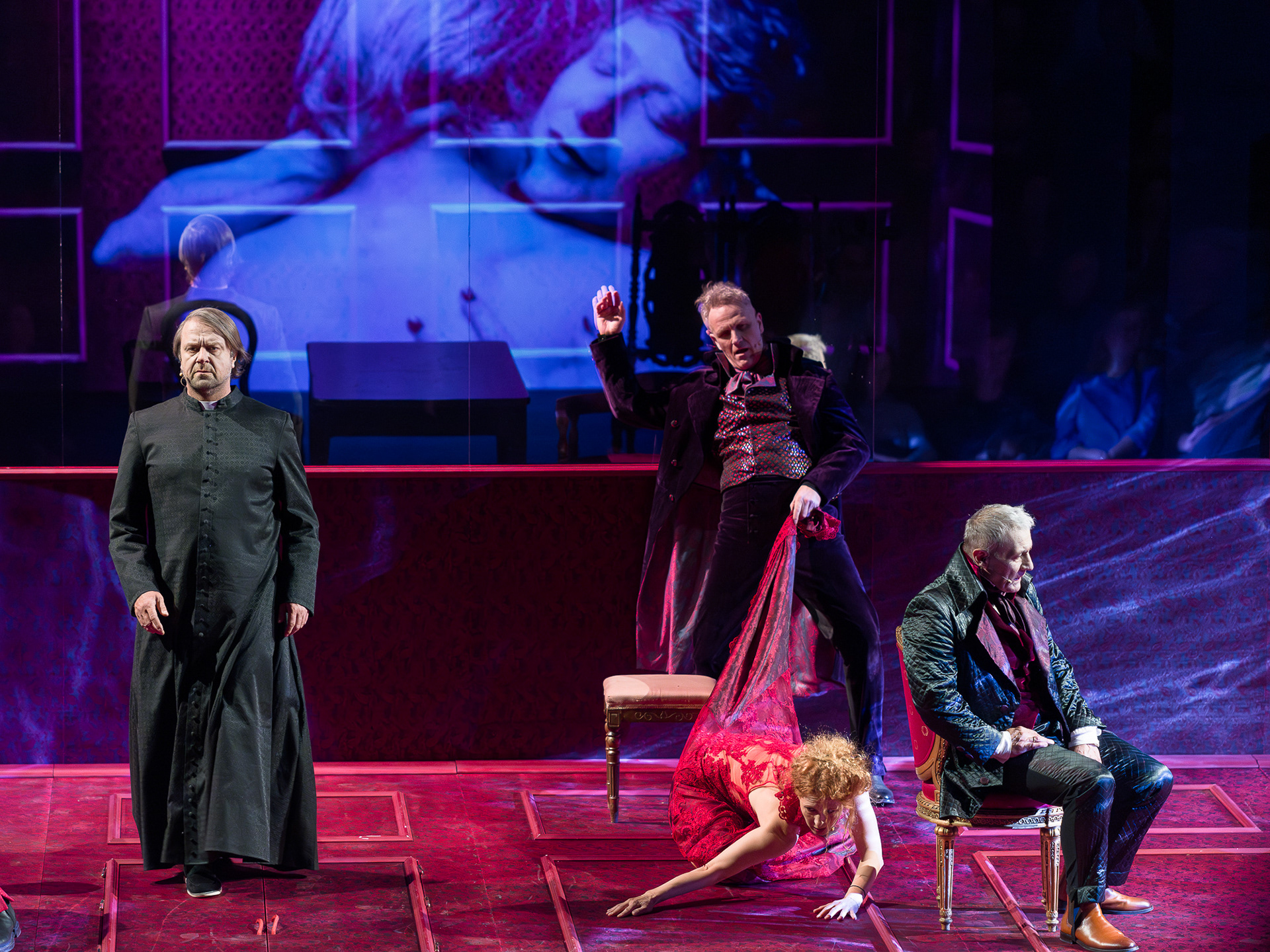 The Red and the Black is a stage adaptation of Stendhal’s classic novel, reimagined as a contemporary investigation into power, manipulation, and human vulnerability. Directed by Bartosz Szydłowski at Laznia Nowa Theatre (premiere: March 23, 2025), the production unfolds through a series of interrogations inside a symbolic “aquarium” on stage, where truth and illusion constantly collide.
